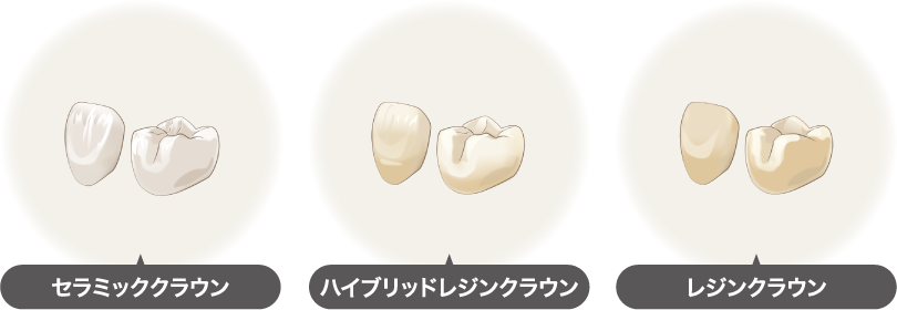 「被せ物(クラウン)」とは、神経をとった歯や、歯質の欠損が大きい場合に「コア(土台)」を入れてから、コアに被せる人工の歯です。被せ物の材料は、保険と保険外で使える材料が異なります。